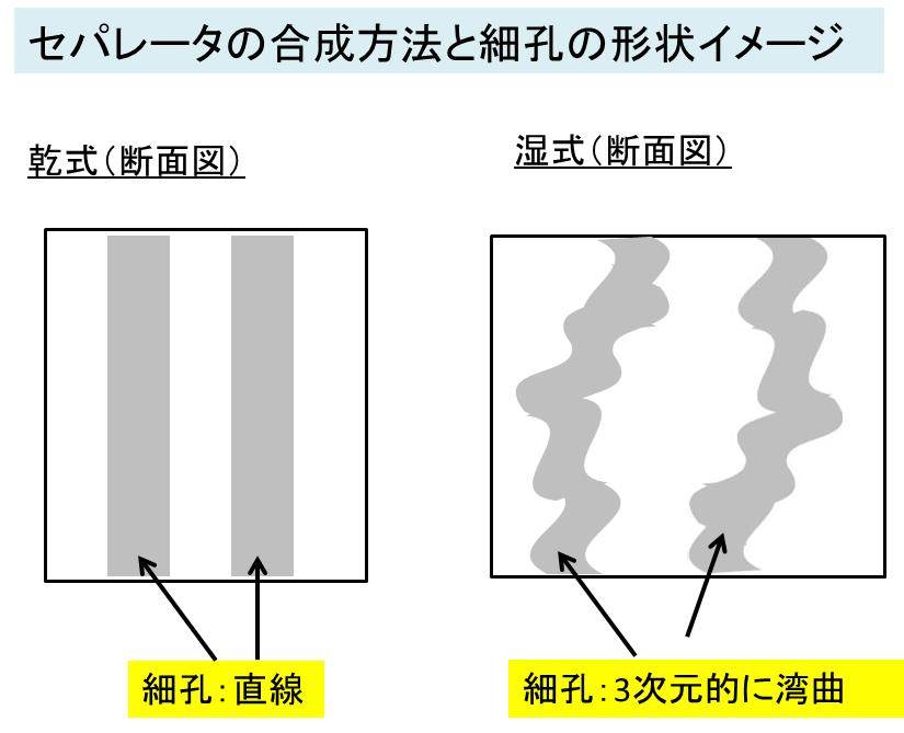 この多孔質中の細孔の三次元構造はセパレータの製造方法により変化します。