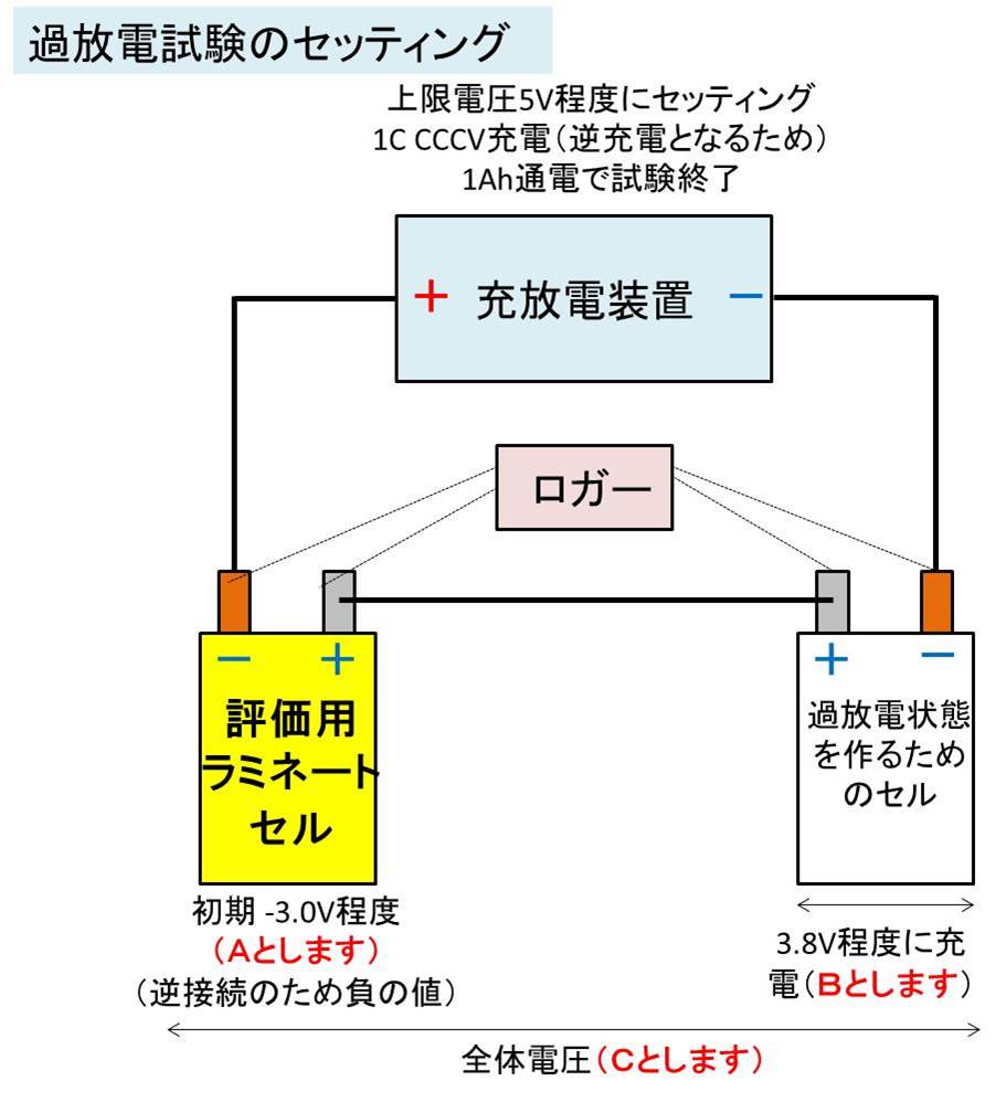試験時強制的に逆充電(通常正極の電位が高く、負極の電位が高いのに対して、その逆となる、つまり電圧値が負の値になるような充電)を起こすため、強制放電試験とも呼ばれます。