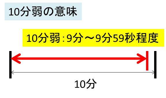 この10分弱の「弱」とは、「不足している」「対象よりも少ない」ことを表すものであるため、10分弱では10分間よりもちょっと短い時間となるわけです。