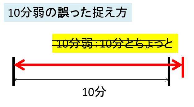 このとき、10分弱と聞いて「10分とちょっと」などと誤った定義で覚えてしまう人がいますが、これは誤りですので気を付けましょう。以下は10分ちょっとの間違った捉え方のイメージです。