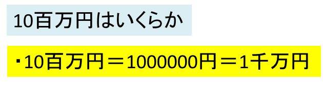 一方で、10百万円では、上の百万円の桁に0を一つつければいいので、10000000円(0が7個)となるわわけです。つまり、1千万円に相当するといえます。