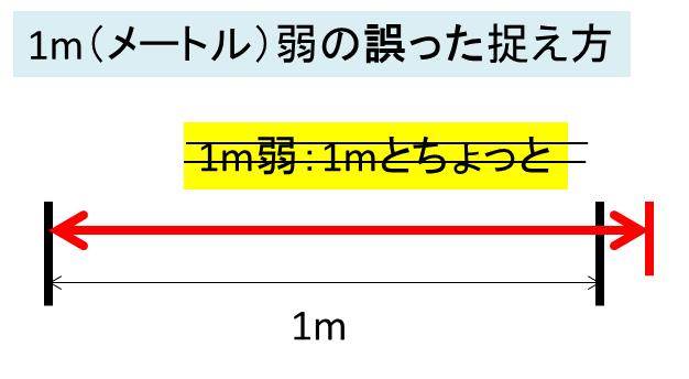 このとき、1メートル(m)弱と聞いて「1mとちょっと」などと誤った定義で覚えてしまう人がいますが、これは間違いですので気を付けましょう。以下、は1m弱ちょっとの間違った捉え方のイメージです。