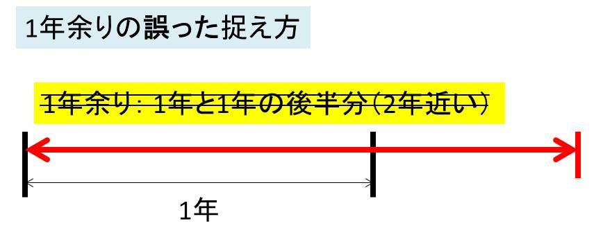 このとき、1年足らずと聞いて「1年とちょっと」などと誤った定義で覚えてしまう人がいますが、これは間違いであることに注意しましょう。以下は誤りの捉え方のイメージです。