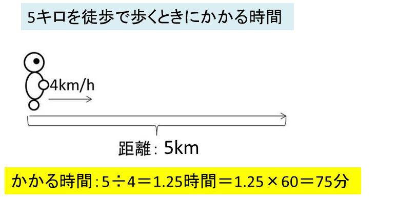 なお、時間を分に直すためには60をかければいいので、5キロを徒歩で移動するのには1.25 × 60=75分かかることがわかりました。