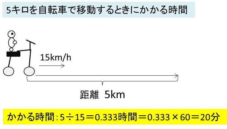 よって、5kmを自転車で動くとすると、5 ÷ 15=0.333 時間=0.333 × 60 =20分程度の時間でいけるのです。