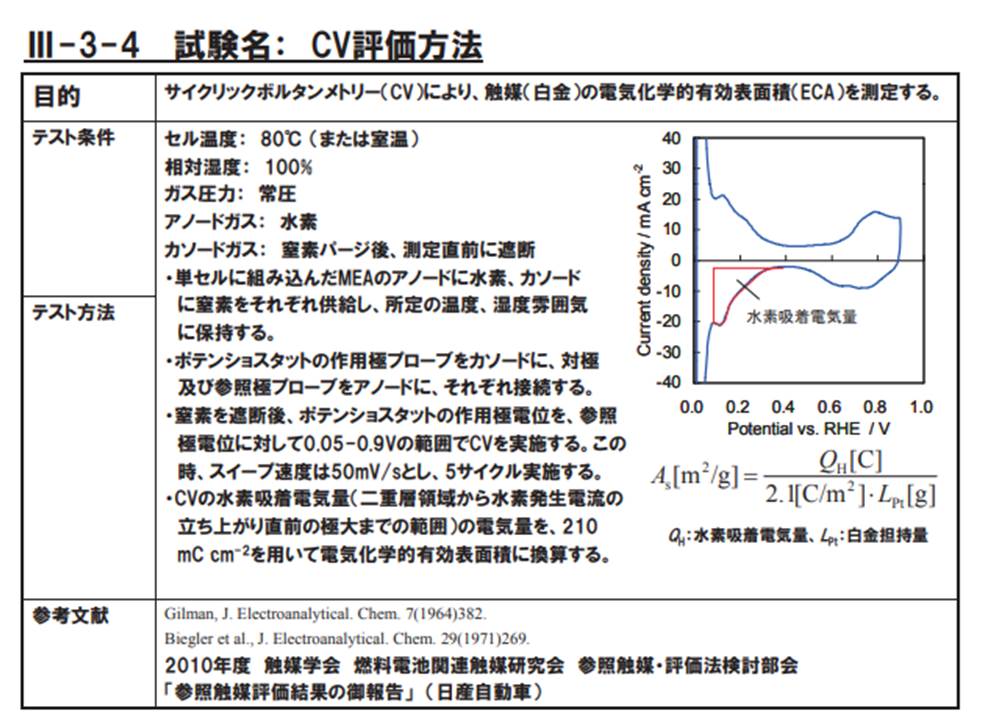 例えば、セル温度:80℃、相対湿度:100%、アノードガス:水素、カソードガス:窒素パージ後直前に遮断し、CVを実施する・・といった内容が記載されています。