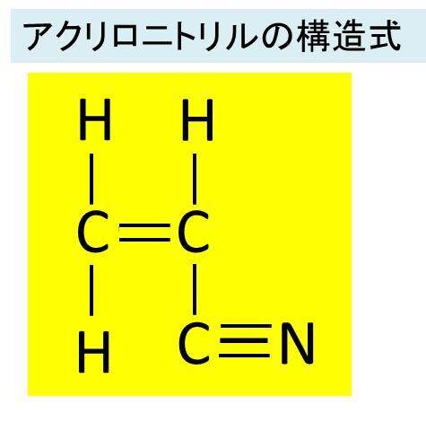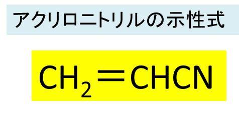 アクリロニトリルの示性式は以下のようになります。CH2=CHCNとビニル基(CH2=CH-)がつくことが特徴的といえます。