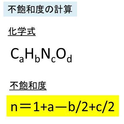 アルコール、アルデヒド、エステルなどの炭化水素以外の物質では、不飽和度の計算が若干難しくなるため、きちんと算出できるよう慣れておきましょう。