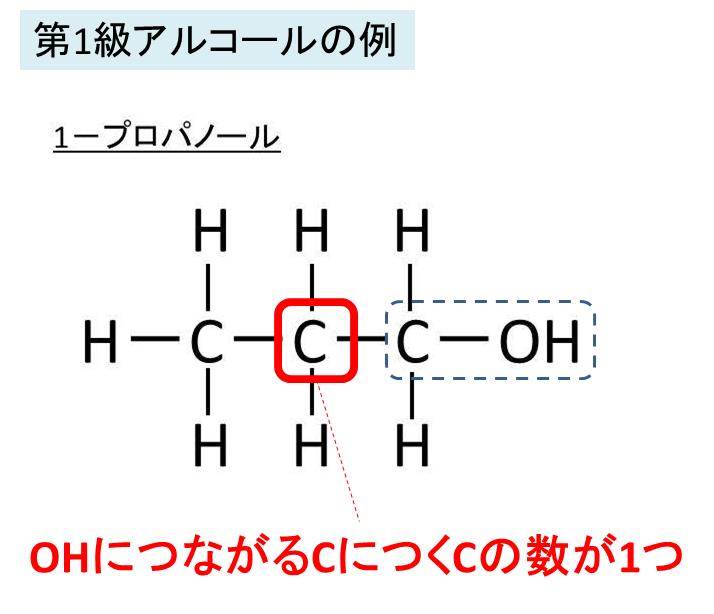 例えば、第1級アルコールであれば、ヒドロキシ基がつく炭素には、一つの炭素がつながっていることとなるのです。