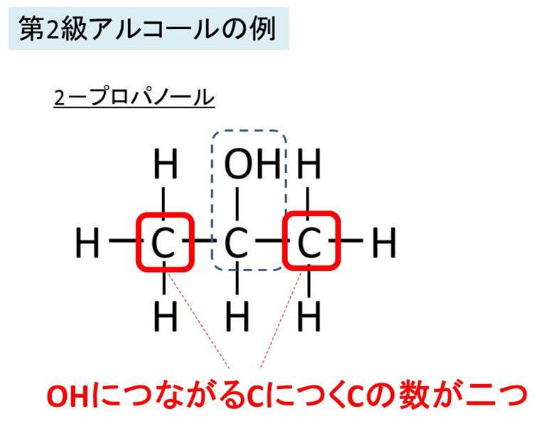 続いて、第2級アルコールであれば、上と同様の理屈でヒドロキシ基がつく炭素につく炭素の数が2つであるものを指すのです。