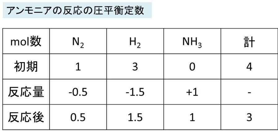 つまり、平衡時にはN2:0.5mol、H2:1.5mol、NH3:1molが生じていたこととなります。
