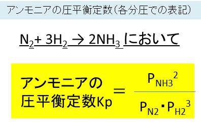 ここで、上のアンモニアの合成反応の圧平衡定数は以下のようにされます。