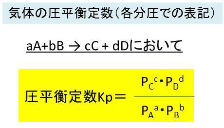 混合気体の反応において、各分圧と反応式の係数を用いると、以下のように圧平衡定数は計算できます。