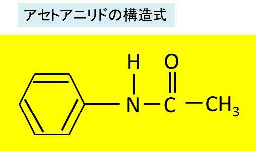 アセトアニリドの構造式は以下のようになります。アニリンをアセチル化させた構造であると覚えておくといいです。