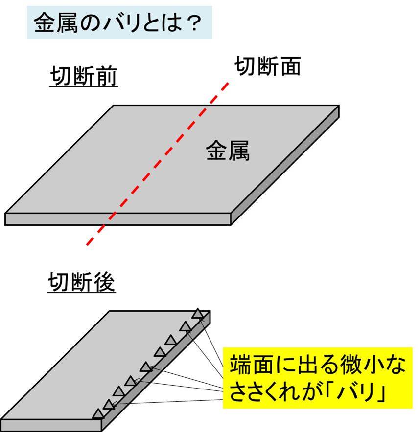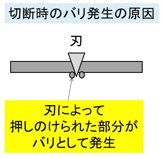 つまり、切断時の金属が押しのけられた部分がバリに相当するともいえます。