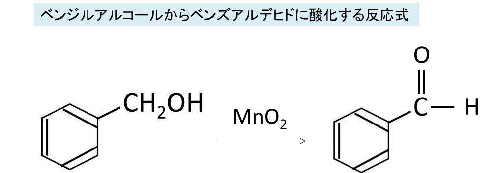 ・ベンジルアルコールを酸化し、ベンズアルデヒドにする反応式【MnO2を使用】