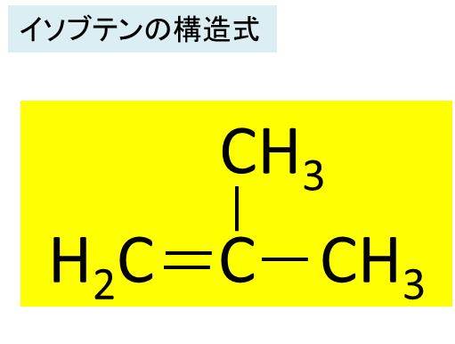 また、以下のよう主鎖の炭素骨格に枝分かれがある構造のイソブテン(2-メチルプロパン)もC3H4で表される構造異性体の一つです。