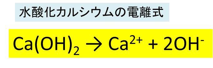 また、水酸化カルシウム水に溶けにくいですが、溶ける際は以下のように電離します。