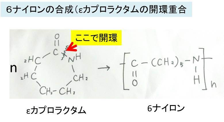 6ナイロンはεカプロラクタムの環の一部を断裂させた(開環)ものが重合することで、起こる開環重合によってつくられるのです。