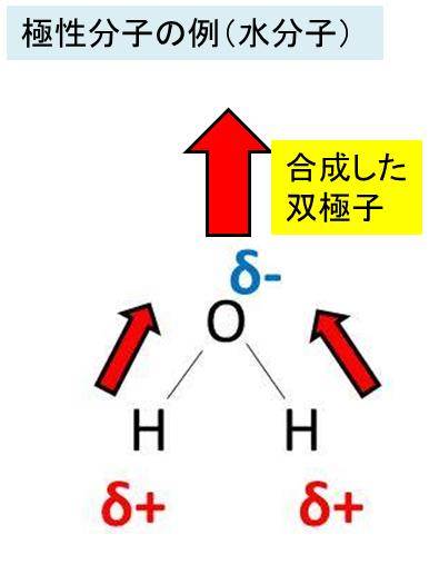 水分子の例では、O原子の方がH原子よりも電気陰性度が高く、O原子が負の電荷を帯びています。