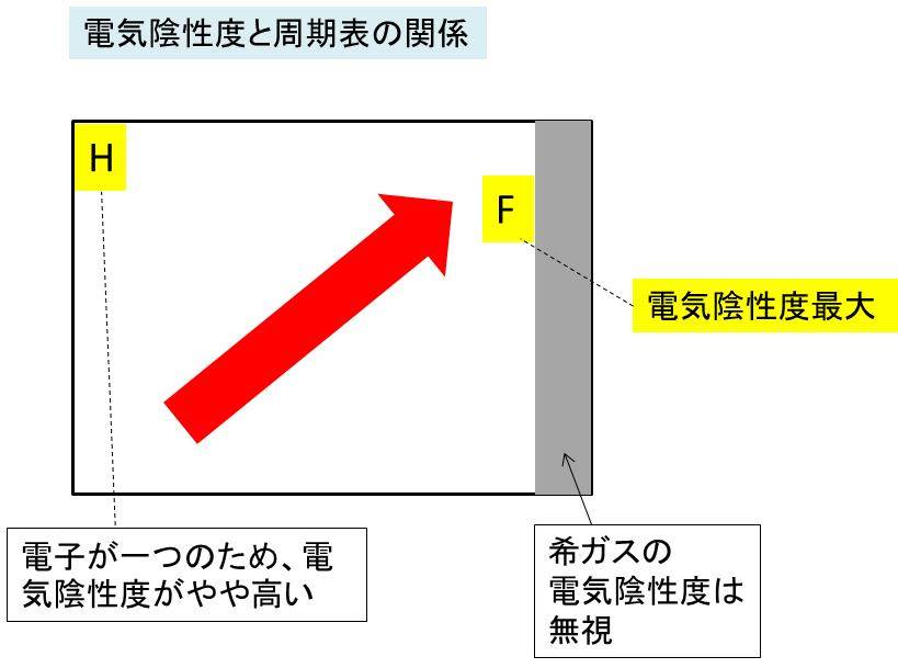 ・電気陰性度の大きさと周期表との関係 希ガスや水素原子は例外?最大の元素はF(フッ素)?