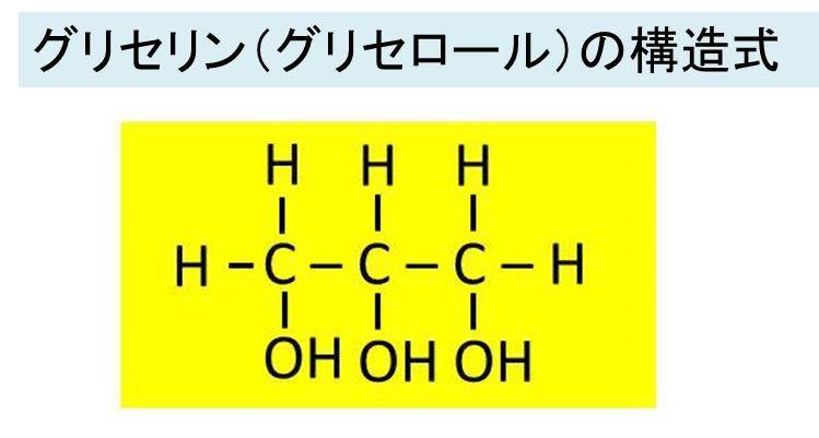 一方で、グリセリンとは物質の名称のことを指し、以下のような構造をとる3価のアルコールの一つです。別名グリセロールとも呼びます。