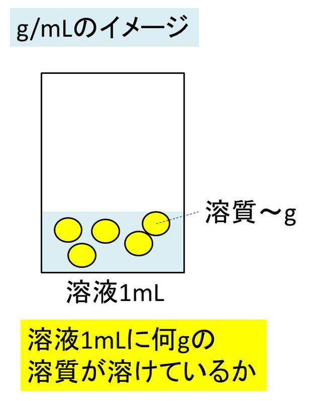 一方で、g/mlとは「溶液1mL(ミリリットル)あたりに溶質が何mg溶けているか」を示す単位といえます。