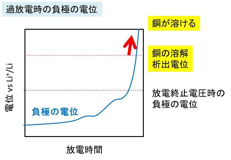 負極の電位が上昇すると、銅の溶解析出電位(標準電極電位)を超えるために、基材箔の銅が溶け出し、セパレータを通過、正極で析出することで負極との短絡が発生します。