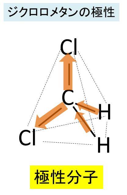 なお、ジクロロメタンが極性分子であることは上の構造をもとに説明することが可能です。