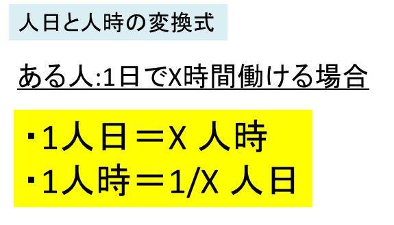 例えば、1日にX時間働ける人であれば、1人日=X人時と変換できるのです。逆に、人日基準で考えると、1人時=1/X 人日と計算できるのです。