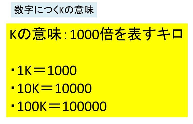 つまり、数値1の後にKがついた1Kであれば、1000のことを表し、10Kであれば10000、100Kであれば100000に相当するというわけです。