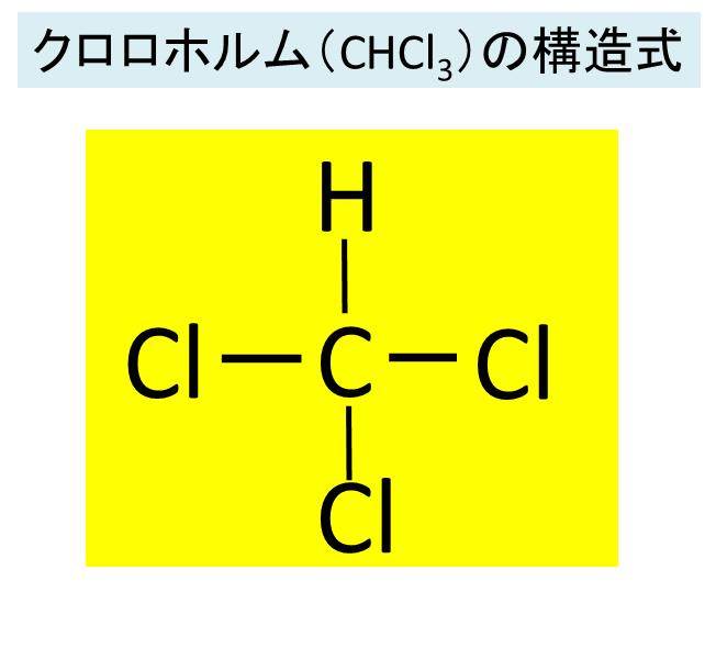 それでは、クロロホルム(トリクロロホルム)の各式について考えていきましょう。なお、クロロホルムは別名トリクロロメタンとも呼びます。