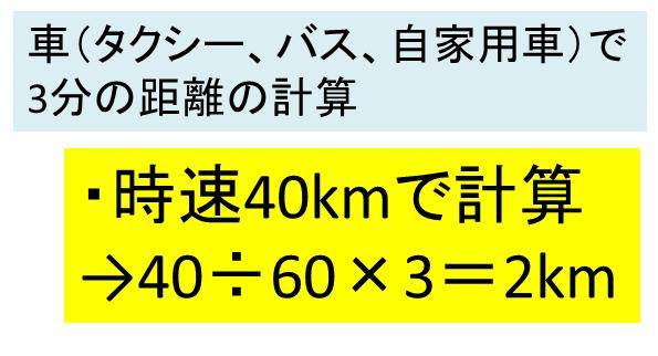 結論からいいますと、車で3分の距離は2km程度といえます。これは、タクシー、バス、自家用車などを含めた車の平均速度(一般道)を40kmとして計算した場合の数値といえます。