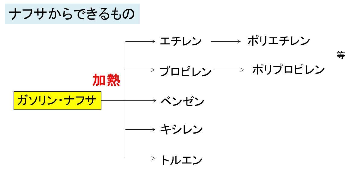 そして、このナフサからできるものとしては、プラスチック、合成繊維などの化学由来製品の原材料(エチレン、プロピレン、ベンゼン、トルエン、キシレン)などが代表的です。
