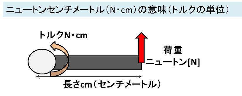 このとき、荷重がかかるところまでの距離をcm(センチメートル)で表記した場合のトルクがニュートンセンチメートルという単位(n・cm)となるわけです。