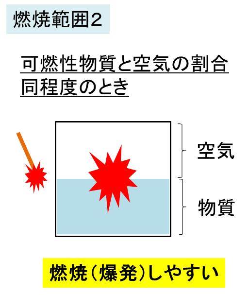 このように、燃焼範囲は基本的に、可燃性物質(蒸気)と酸素供給体(空気)との割合で決定されます。