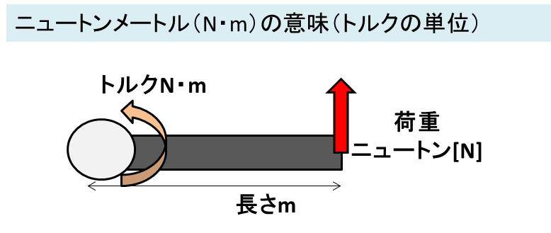 つまり、ニュートンメートル(n・m)=ニュートン(n)×メートル(m)で表現できるトルクの単位といえます。