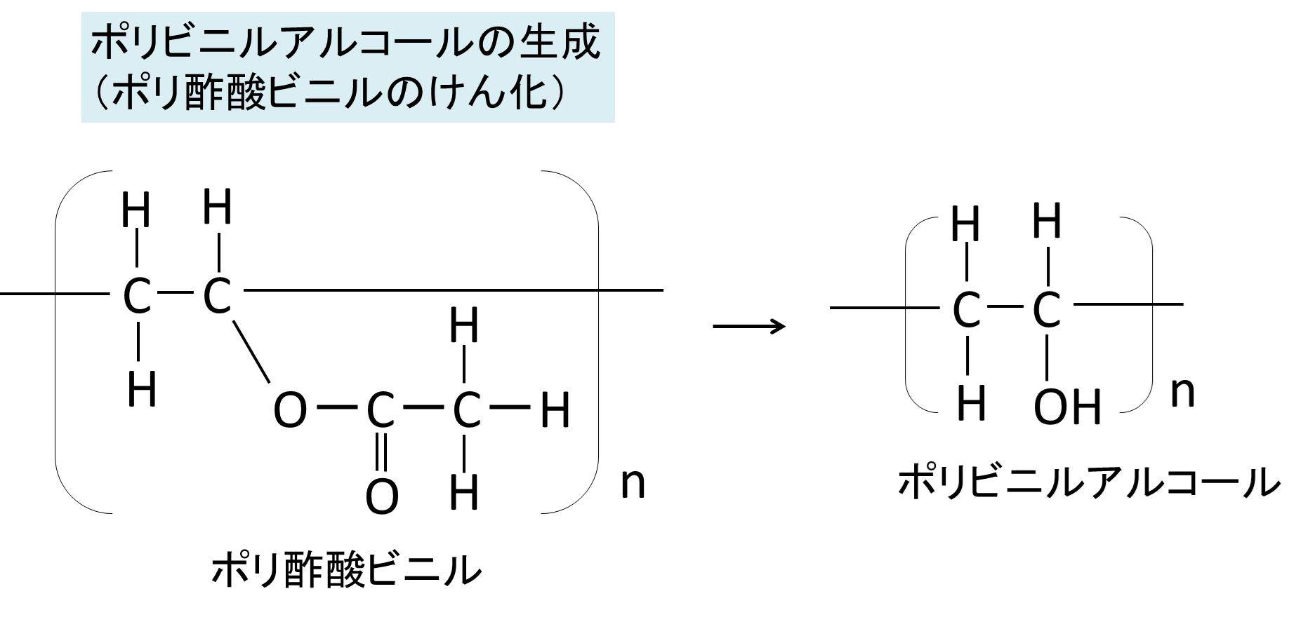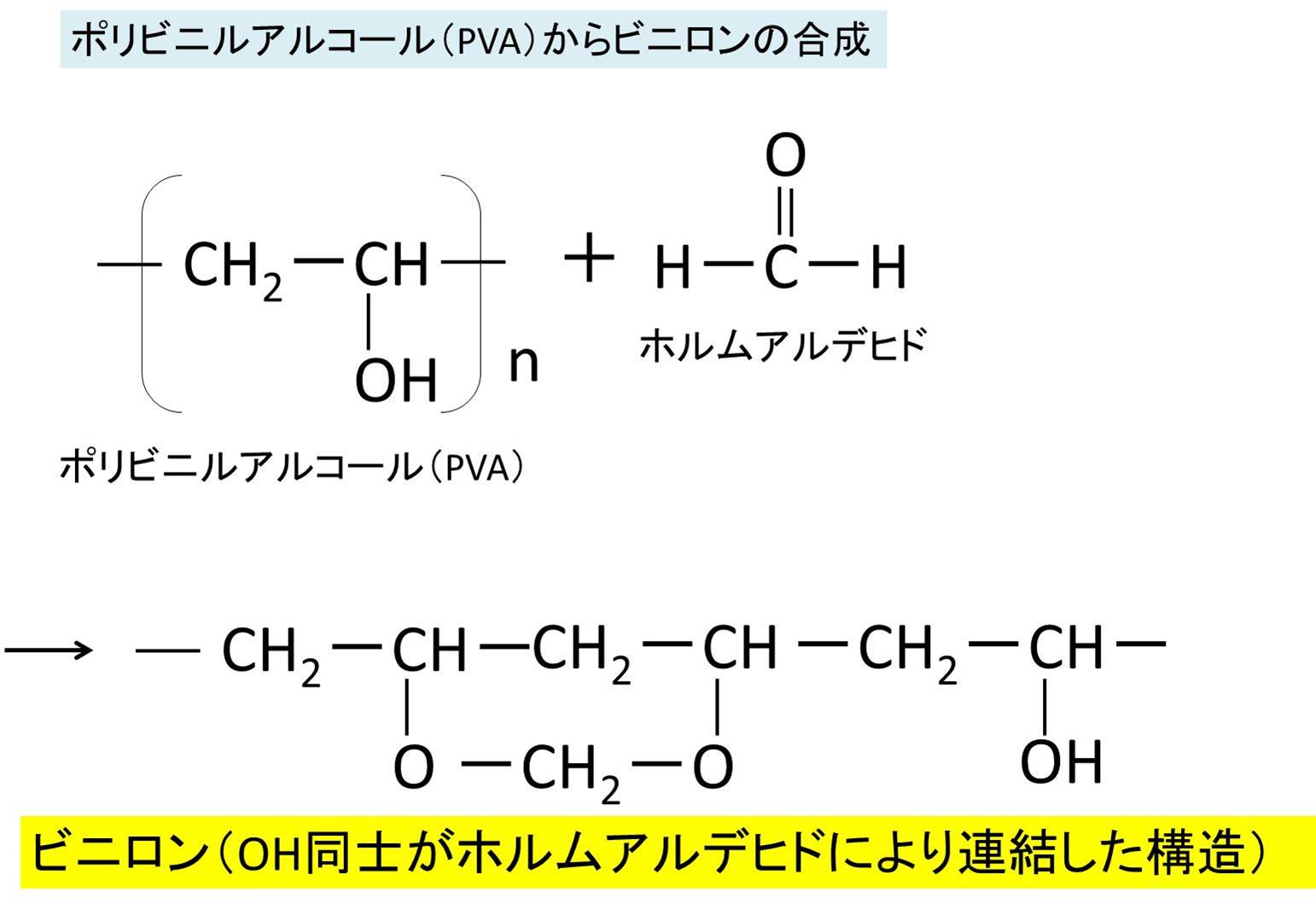 ビニロンの合成方法 酢酸ビニルの付加重合、アセタール化、けん化の反応式【ポリビニルアルコールやホルムアルデヒド】 関連ページ