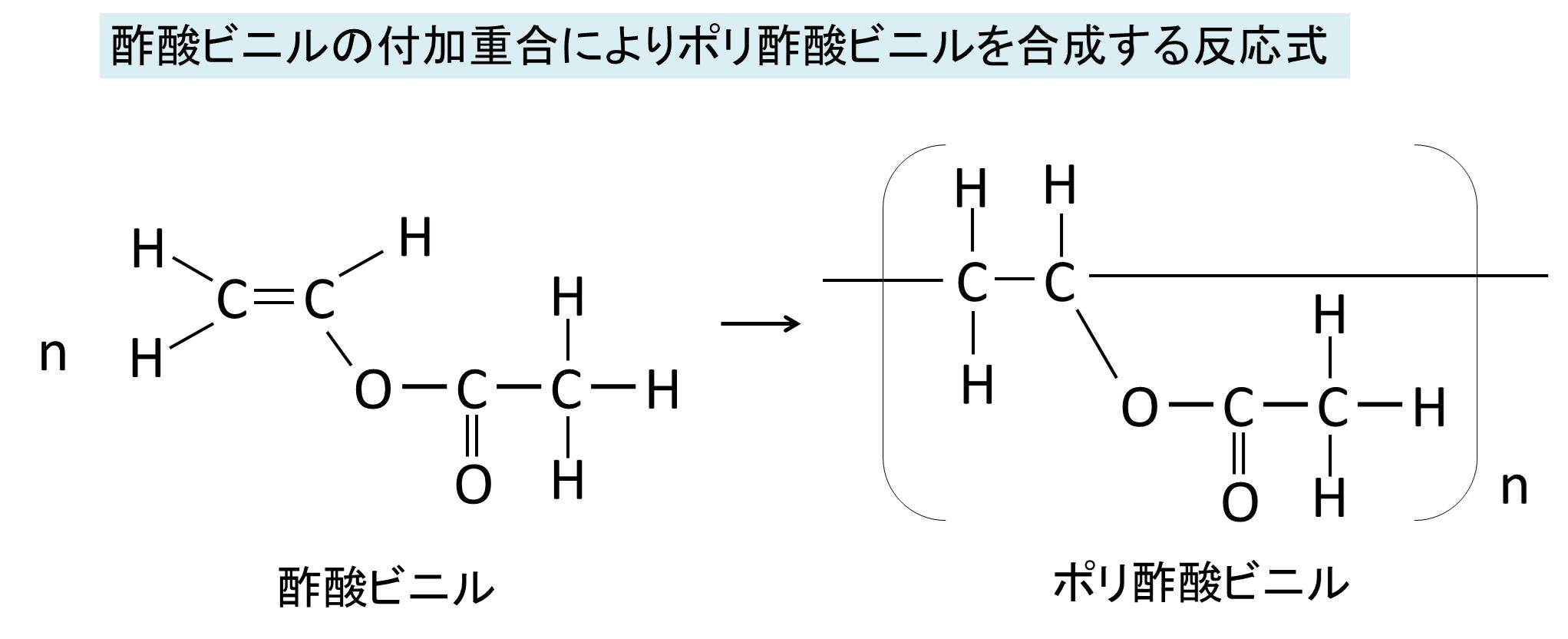 ビニロンを作るためには、まず酢酸ビニルの付加重合によりポリ酢酸ビニルを合成します。