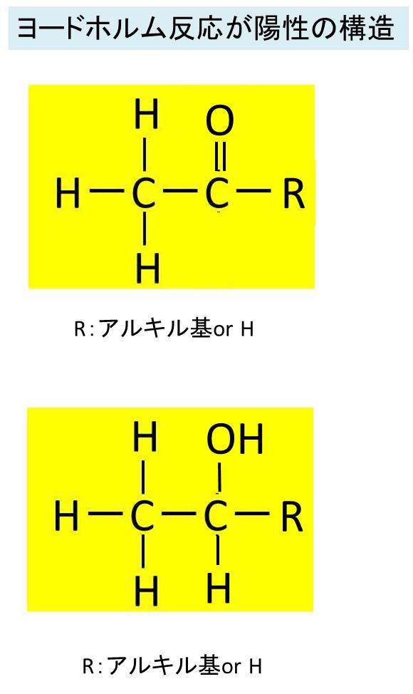 ヨードホルム反応が陽性となる構造として「アセチル基(カルボニル基の片方がメチル基):CH3CO-を持っており、これにつく置換基がR(アルキル基)か水素原子」もしくは「酸化されるとアセチル基となる物質」が当てはまります。