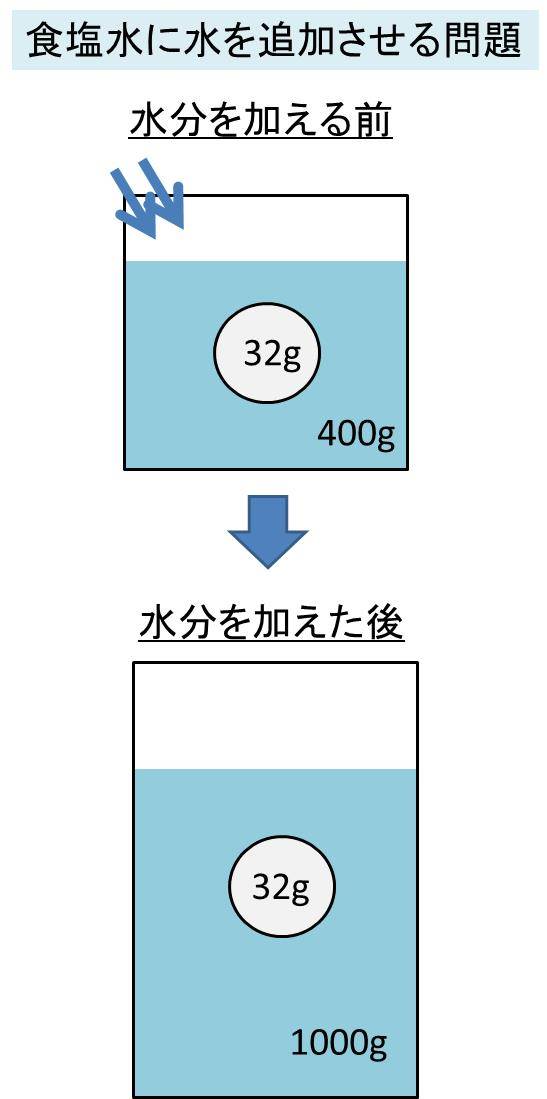 よって、今回のケースでは、400 × 0.08= 32g分の塩が含まれます。このとき、水を添加するため、配合されている塩の量は変化しませんが、溶液全体の量が600g増えた1000gとなるのです。
