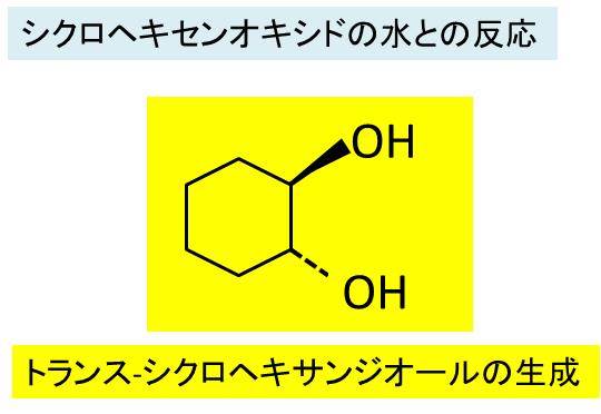 そのため、エポキシドの反応として有名な酸触媒下での水との反応が起こり、エポキシ基が開環されます。そして、トランスのシクロヘキサンジオールが生成されるのです。