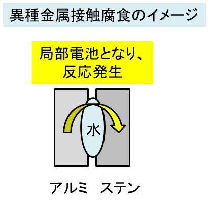 ステンレスが腐食する形態として、異種金属接触腐食というものがあります。異種金属が接触した状態で、水などのイオンを伝えることができる媒体が付くと、局部的な電池を形成して劣化します。