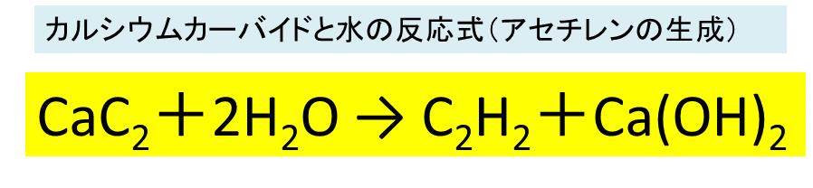 このアセチレン(と水酸化カルシウム)の発生の反応式は以下の通りです。