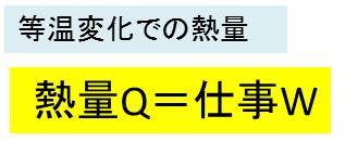 つまり等温変化では、熱量Qと仕事Wは一致することとなるのです。式にすると、以下の通りとなります。