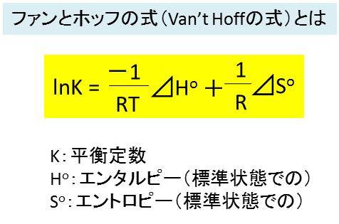 ファントホッフの式(Van't Hoffの式)とは、化学平衡における平衡定数と反応でのエンタルピー・エントロピーを結びつける式のことを指します。平衡定数の温度依存性を示した式ともいえます。