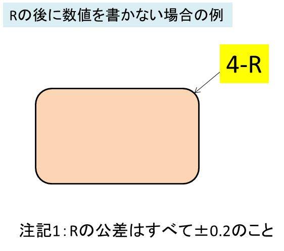 さらに、部材のR部の寸法を細かく指定する必要がない場合(干渉などを特に考えなくていいケース)では、Rの後に特に数値を入力せず、一般公差や注記に従うようにすることも多くあります。以下のようなものです。