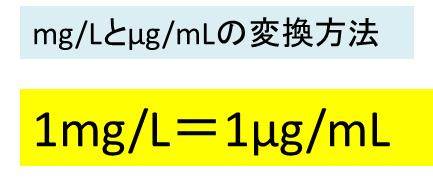 ここで、mg/Lとμg/mLの変換において、1mg=1000μg、1L=1000mLであることを用いると、1mg/L=1000μg/1000mL=1 μg/mLと換算できます。