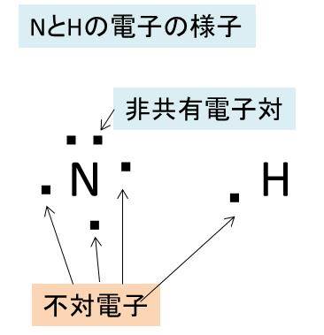 そして、アンモニアのNの電子の数は不対電子が3個であり、非共有電子対が1個あります。一方で水素原子Hの電子の数が1個であるため、Hが3個含まれるアンモニアでは、先にも述べたようにローンペアが一つとなるわけです。