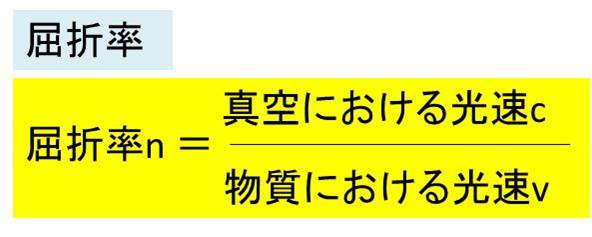 屈折率(絶対屈折率)の定義は、真空中における光速をある物質中を通過しているときの光速で割った値のことを指します。以下のような計算式です。